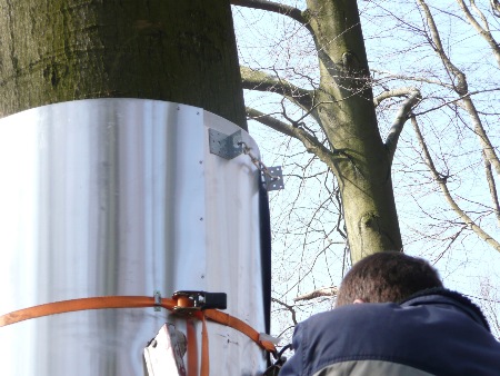 Zum Schutz der Schwarzstorch - Nester hat das Forstamt Nidda Baummanschette anbringen lassen. Dadurch soll der Verlust von Gelege bzw. Jungstörchen durch Waschbär und Co. verhindert werden. Die Fotos hat Ulla Heckert zur Verfügung gestellt.
