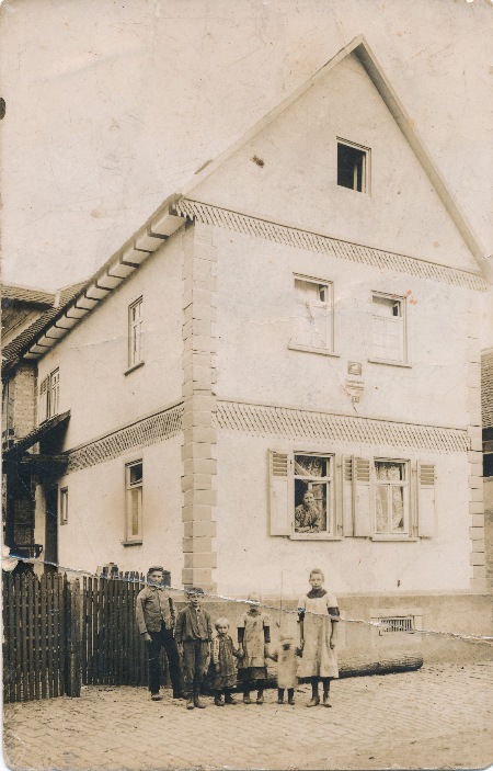 Das Foto zeigt das Haus Raunstraße 13, das „Stammhaus“ der Familie Wagner. Aus dem Fenster schaut Elise Wagner, geb. Knöpp. Vor dem Haus stehen die Geschwister Heinrich, Karl, Hedwig (verheiratete Weber), Lina, Hugo und Hilda Wagner.
